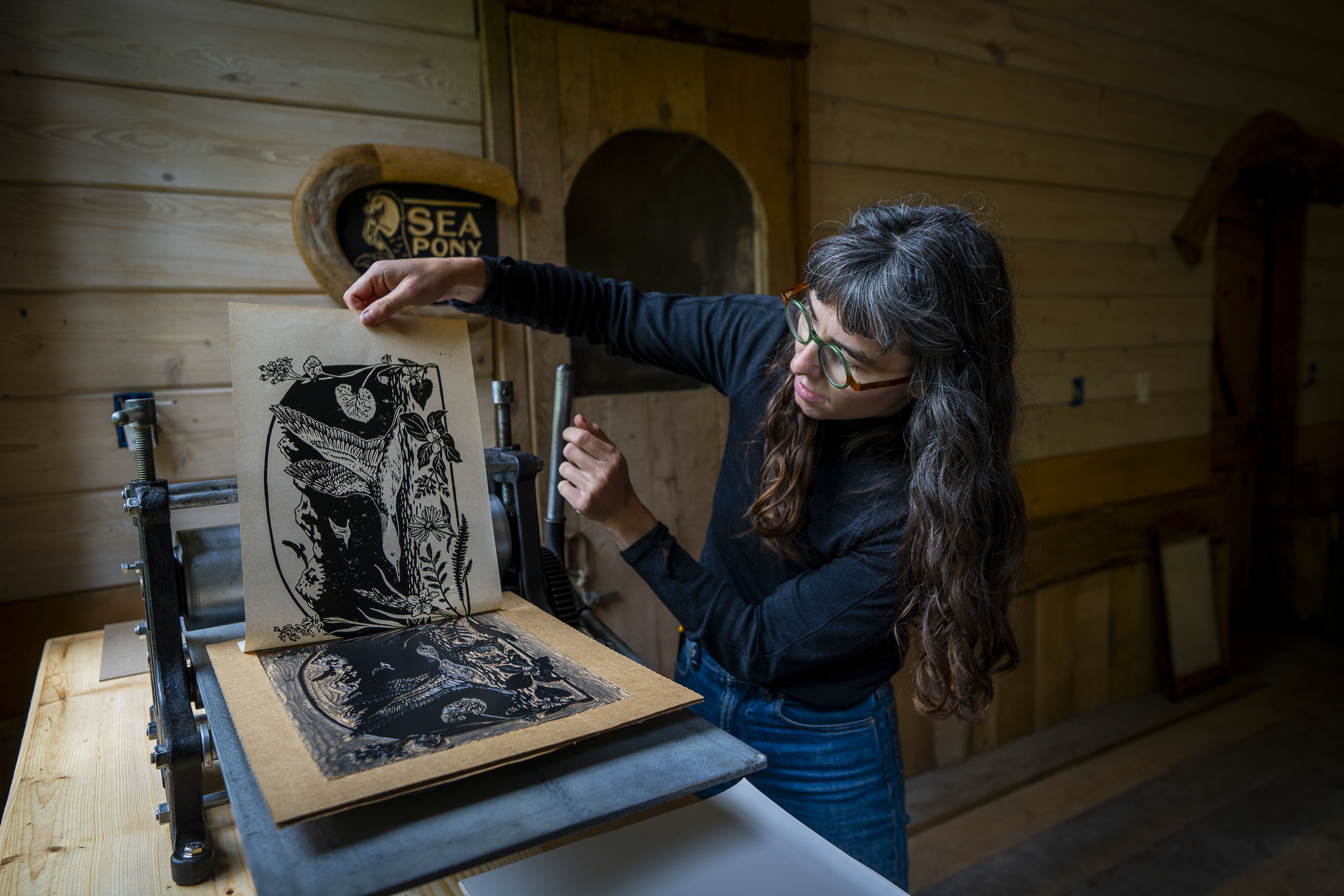 In 2025, SCS hosted LA-based printmaker Elizabeth Jean Younce at Sea Pony Farm, to help us continue Eric Bealer’s printmaking legacy. Elizabeth holds an MFA in Printmaking and has taught at the Sitka Fine Arts Camp for 5 years. With the help and experience of Elizabeth, Eric Bealer’s Vandercook Press No. 3 proofing press and smaller etching press are both up and running; a project called Sea Pony Press.