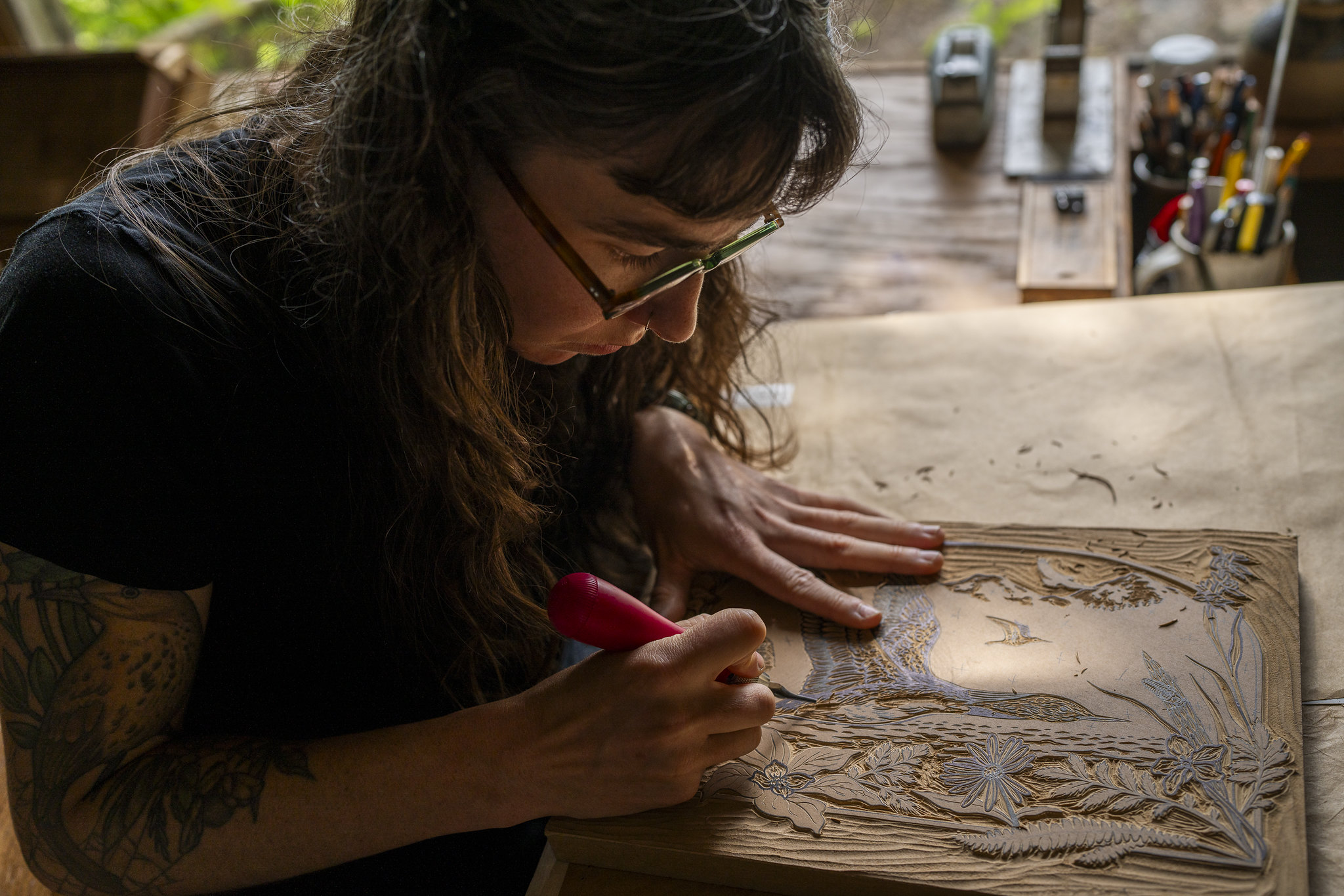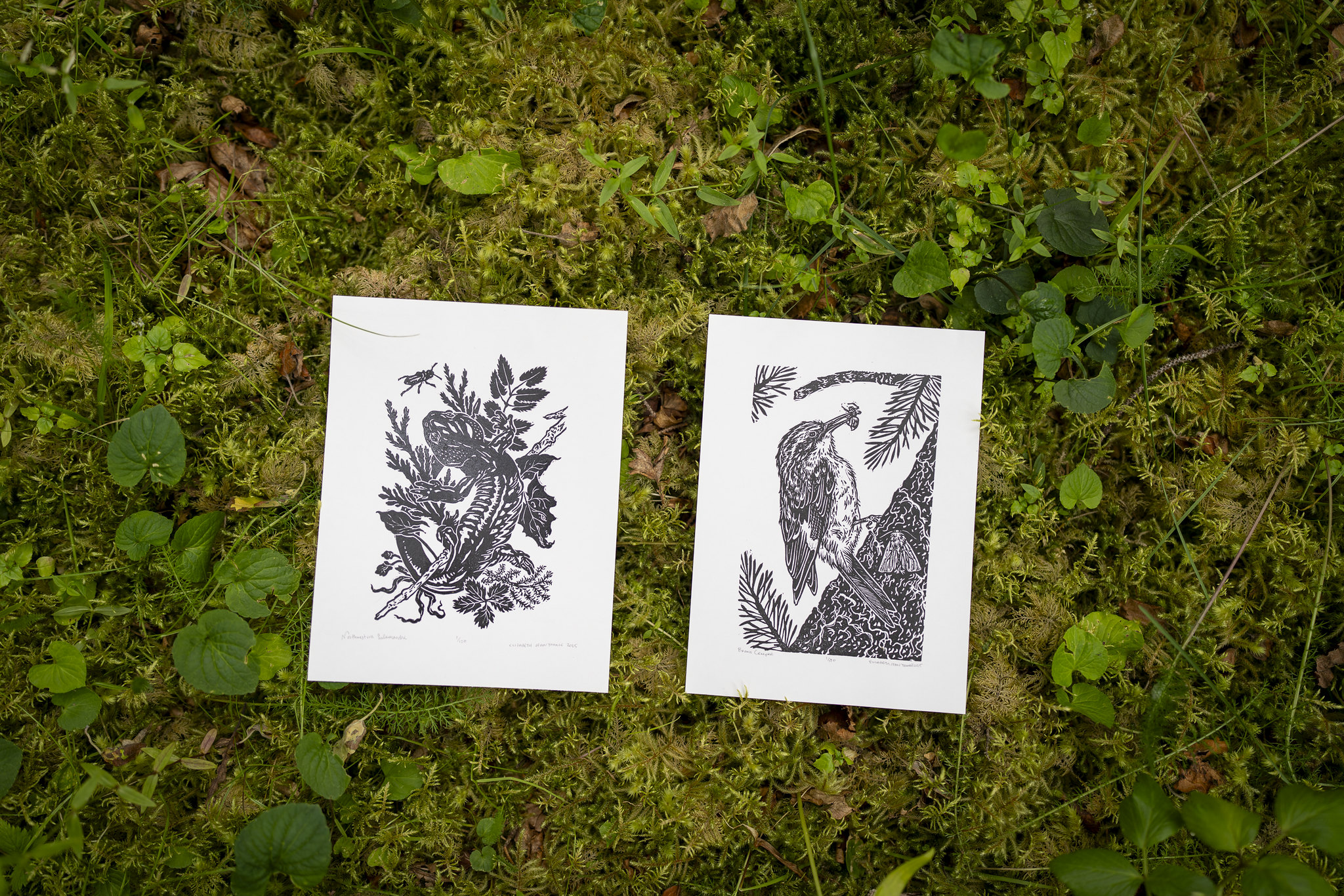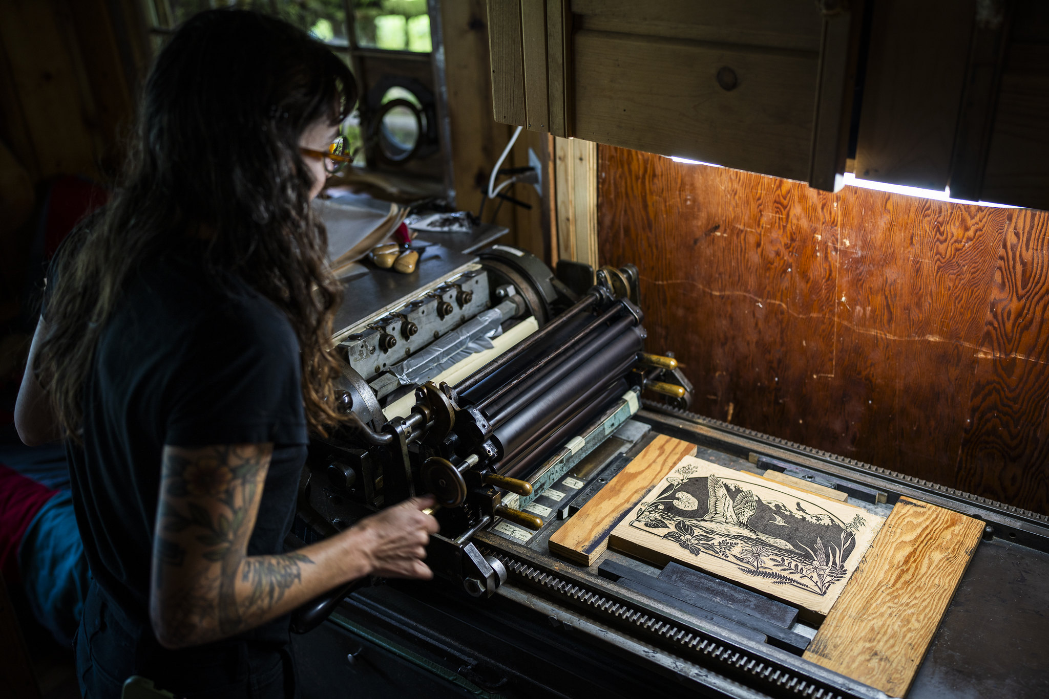 During her residency, Elizabeth created three beautiful linoleum blocks of species that inspired her during her time at Sea Pony Farm: a red throated loon and flora, a northwestern salamander, and a brown creeper. These became the first original block prints carved and printed on these presses in 7 years.
